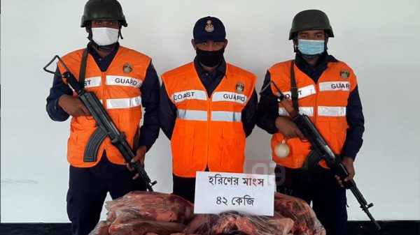 বাগেরহাটের মোংলা থেকে ৪২ কেজি হরিণের মাংস জব্দ করেছে কোস্টগার্ড সদস্যরা। বুধবার (২ ফেব্রুয়ারি) সকালে কোস্টগার্ড মোংলা পশ্চিম জোনের সদস্যরা ঢাংমারী এলাকায় অভিযান চালিয়ে হরিণের ওই মাংস জব্দ করে। তবে