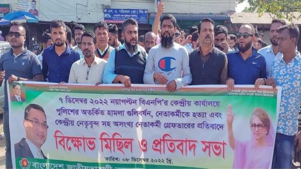রাজধানীর নয়াপল্টনে বিএনপির কেন্দ্রীয় কার্যালয়ের সামনে পুলিশের সঙ্গে সংঘর্ষে মকবুল হোসেন (৪০) নামে এক ব্যক্তি নিহত ও বিএনপির নেতাকর্মীদের গ্রেফতারের প্রতিবাদে বিক্ষোভ মিছিল করেছে সুনামগঞ্জ জেলা বিএনপি। বৃহস্পতিবার (৮ ডিসেম্বর)