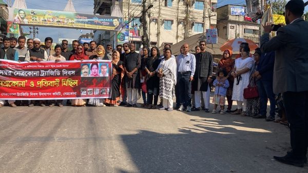 আত্মঘাতী বোমা হামলায় নিহতদের স্মরণে ট্রাজেডি দিবসে ৩ মিনিট ‘স্তব্ধ নেত্রকোনা’ কর্মসূচিতে সাংস্কৃতিক কর্মীরা। প্রতি বছরের মতো এবারও উদীচীর সামনে আত্মঘাতী বোমা হামলায় নিহতদের স্মরণে ট্রাজেডি দিবসে ৩ মিনিট ‘স্তব্ধ