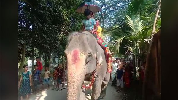 নেত্রকোনায় হাতির পিঠে চড়ে বউ আনতে গেলেন শালমান শাহ (২৪) নামে এক যুবক। আর এমন বরযাত্রা দেখে ভিড় জমালেন পাড়াপ্রতিবেশী। শুক্রবার (৪ নভেম্বর) দুপুরে নেত্রকোনা সদরে ঘটে এ ঘটনা। উপজেলার